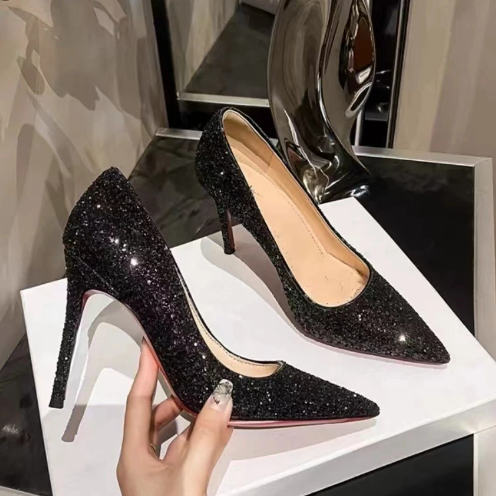 Sexy Black High Heels for Women Stiletto Pointed Black High Heels Shiny Pumps 2025 Spring/autumn Fashion Elegant Women's Shoes